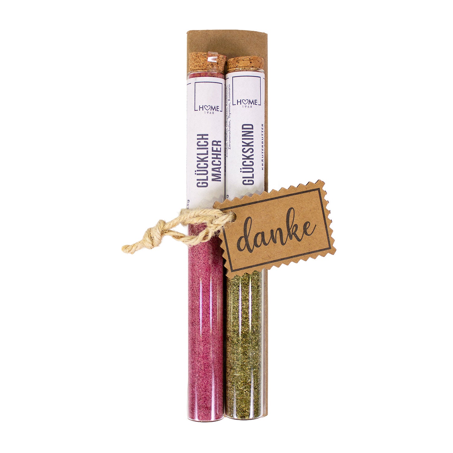 Inhalt: Glücklichmacher, Rote Bete Salz 45g, Glückskind, Kräuterbutter 15g, Anhänger "danke" (Spruch kann variieren!)